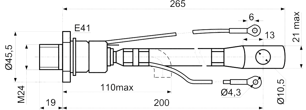 Основание тиристора является анодом, гибкий вывод - катодом.