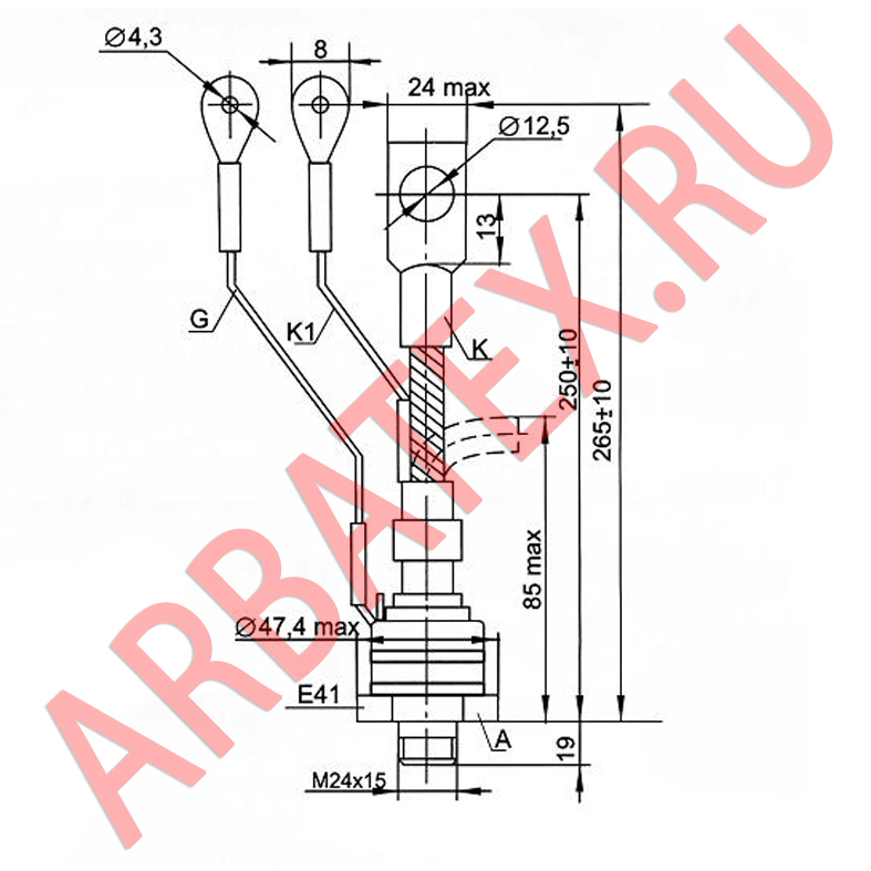 Тиристоры быстродействующие ТБ251, ТБ261, ТБ271 - штыревые тиристоры, регулируют и преобразовывают постоянный и переменный ток до 250А частотой до 20кГц в цепях с напряжением 300В - 1400В.